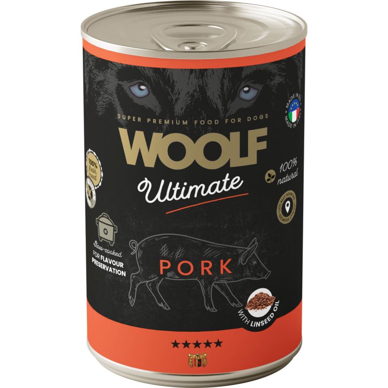 WOOLF Ultimate Dog Adult Pork with linseed oil to kompletna, bezglutenowa karma na bazie wieprzowiny z olejem lnianym stworzona z myślą o dorosłych psach wszystkich ras. Receptura zawiera ograniczoną liczbę składników, pochodzących od lokalnych dostawców. Wszystkie składniki są poddane procesowi wolnego gotowania w niższej temperaturze dla zachowania wartości odżywczych oraz doskonałej smakowitości. Wieprzowina jest mięsem o wysokiej wartości odżywczej, natomiast olej lniany dzięki swoim właściwościom przeciwutleniającym poprawia elastyczność skóry i pozytywnie wpływa na procesy trawienne.