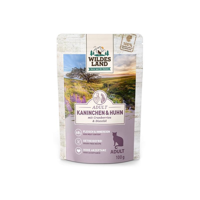 Wildes Land Królik i Kurczak z żurawiną – bezzbożowa, naturalna mokra karma dla dorosłych kotów. 68% mięsa, 2 źródła białka, bez sztucznych dodatków. Z dodatkiem oleju szafranowego i żurawiny – wspiera odporność i zdrowie układu moczowego.