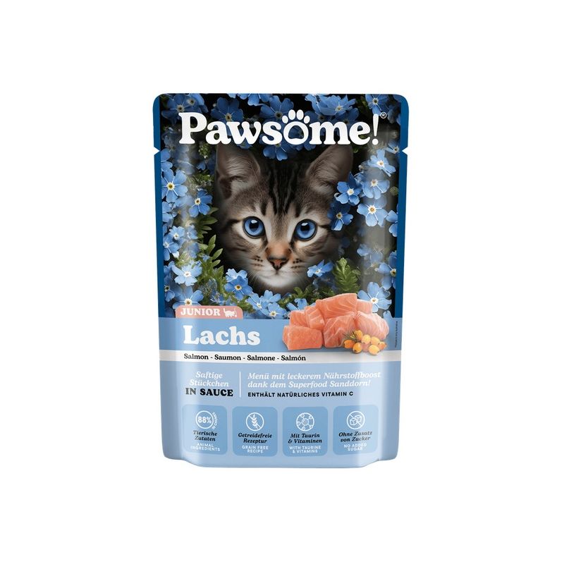 Pozwól swojemu kotu zasmakować w wyjątkowej kompozycji kurczaka i łososia, zamkniętej w soczystym sosie. Mokra karma Pawsome to naturalne składniki, wysoka zawartość białka oraz funkcjonalne dodatki wspierające zdrowie i witalność kota.